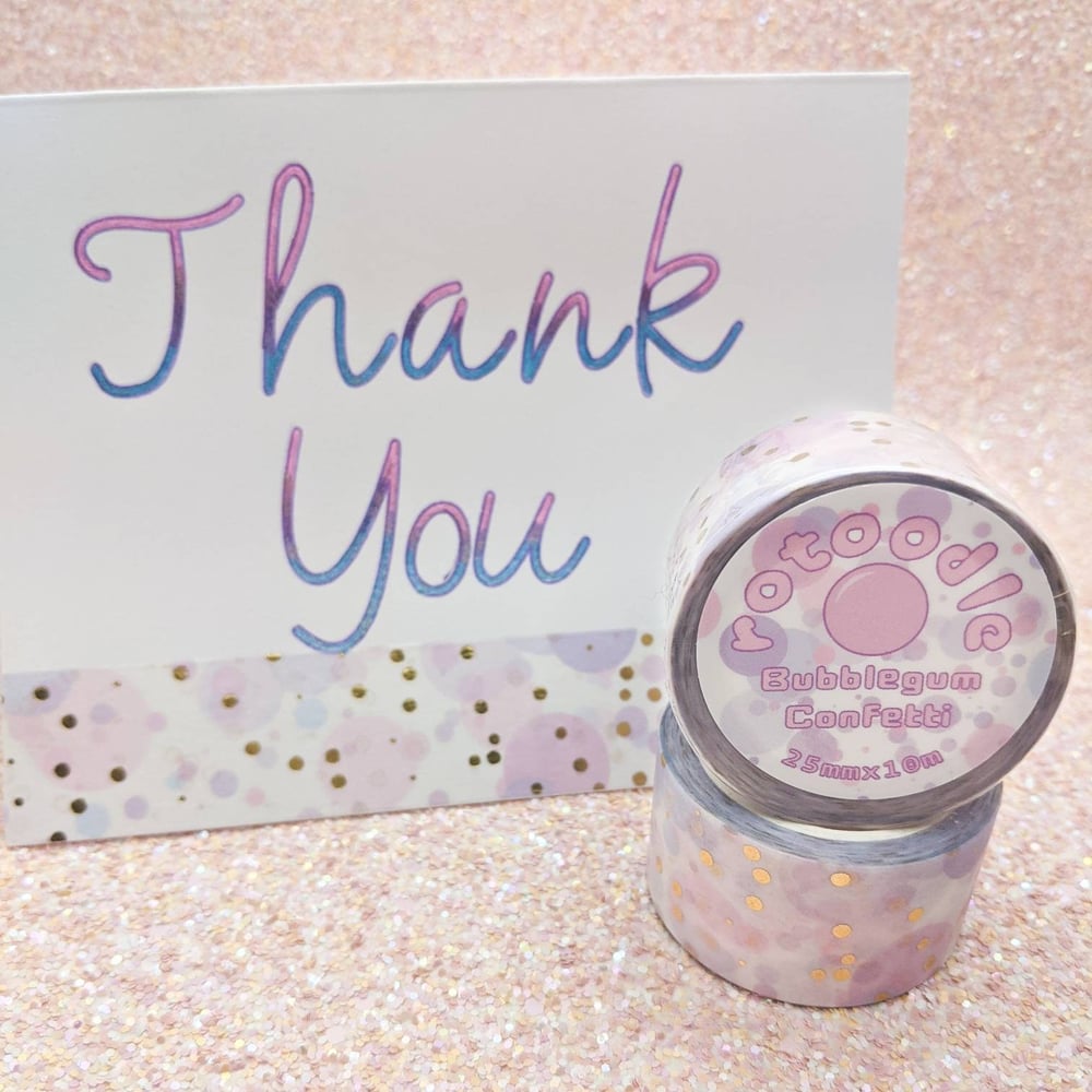 A 25mm wide washi tape featuring gold foil accents and pastel blue, pink, and purple circles.