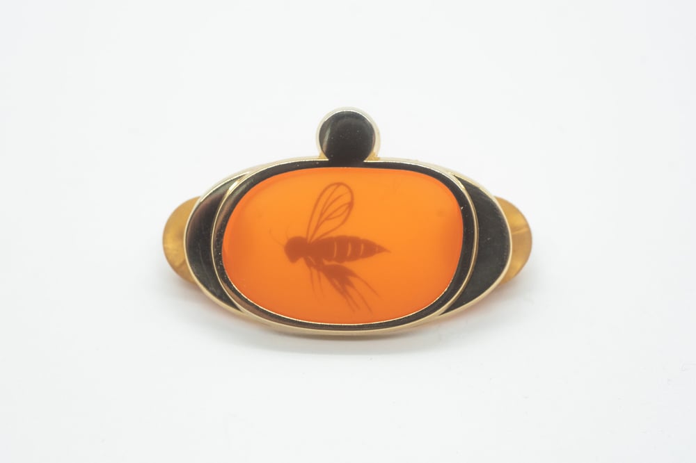 The amber pin features two layers of translucent enamel, a screen printed design, and a spinning top half.