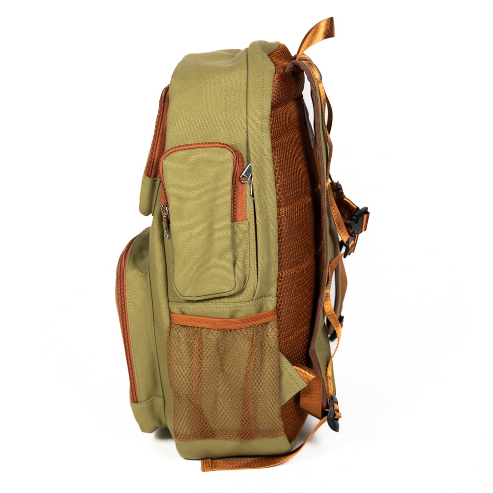 All bags have a mesh back panel and underside of the straps. An adjustable chest strap is attached as well. Both sides of the bag have a mesh water bottle pocket. One side has an extra zipper accessory pocket. Straps measure approximately 28" when fully extended. Chest strap measures approximately 10" fully extended.