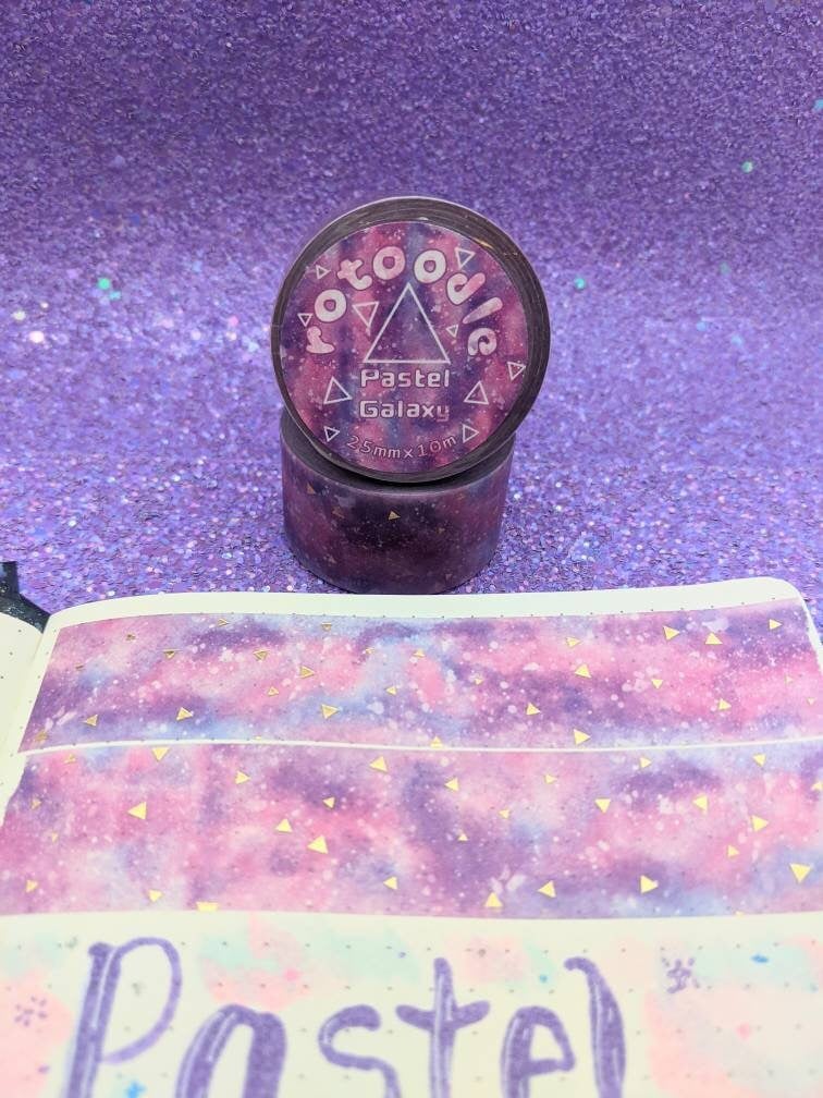 A 25mm wide washi tape featuring gold foil triangular accents and a pastel pink and purple galaxy inspired background.